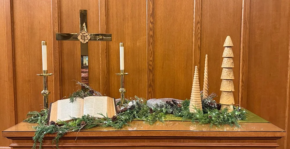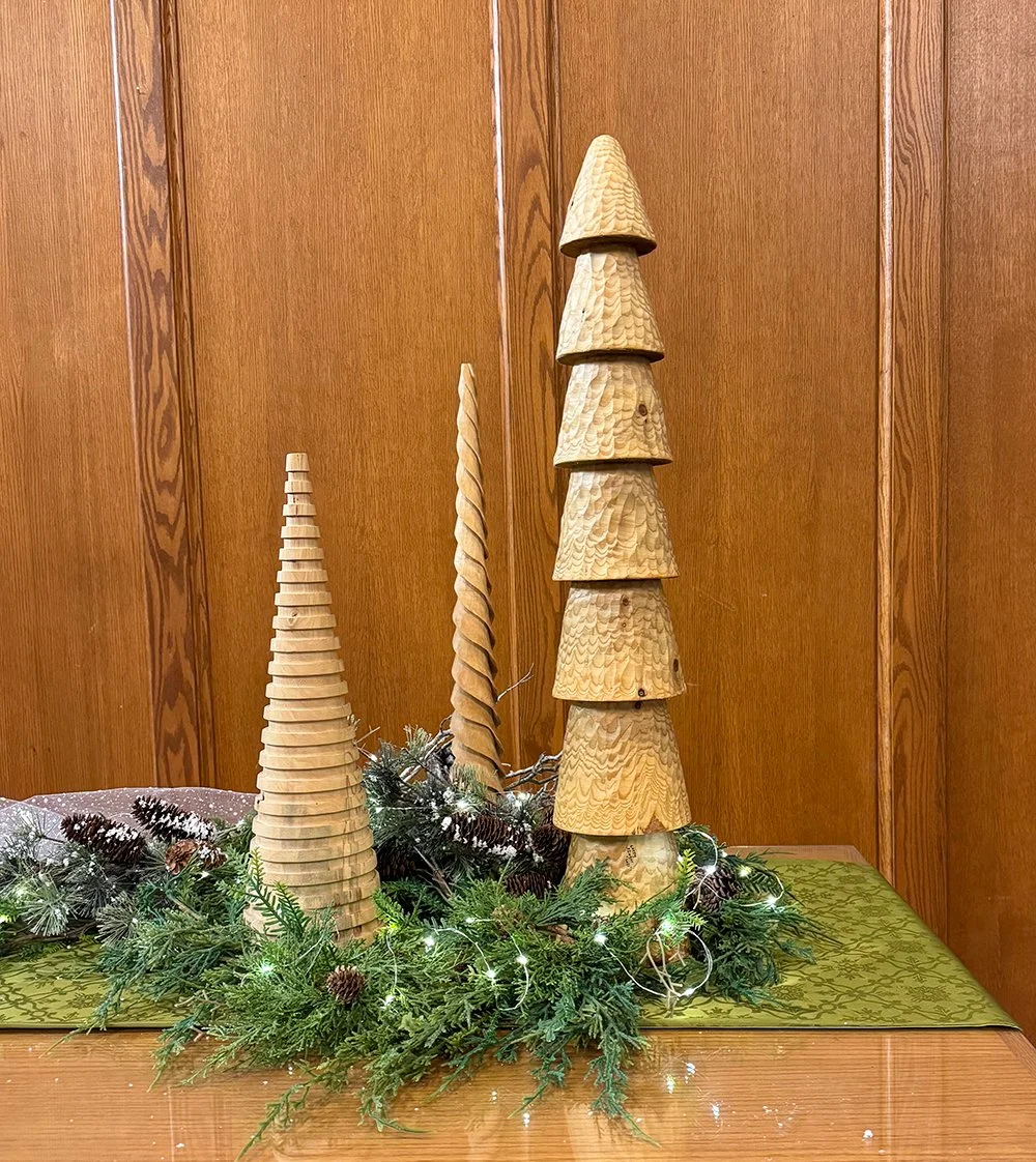 That chance encounter sparked a 20-year love of carving wood into a variety of kitchen items, including spoons, bowls, and cutting boards. The three carved trees featured on the altar are made from one of the following woods: pine, mahogany, or basswood.